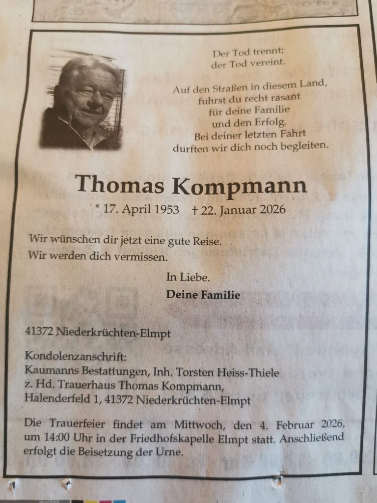 Wir nehmen Abschied von unserem langjährigen Freund und Vereinkameraden Thoams Kompmann. Auch wenn er in den letzten Jahren nicht mehr so aktiv in Erscheinung getreten ist, kannten und schätzten ihn viele von uns.